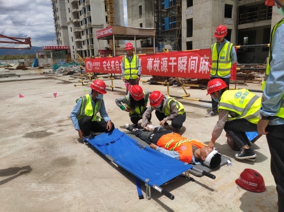 6月(yuè) ♣21日(rì),直管五部和(hé)安裝二分(fēn)公司共同參建的(de)保山(shān)永昌瑞園建設項目開(kāi)展高(gāo)空(kōng)墜落應急演練。“報(bào)告總指揮,施工(gōng)現(xiàn)場(c®×≥Ωhǎng)有(yǒu)人(rén)踩空(kōng)跌落,已倒地(dì)昏迷,情況 ∞↑緊急。”接到(dào)電(diàn)話(huà)後,項目經理(lǐ)立刻啓動救援工(gōng)作(zuò):應急搶險組疏散通(tōng)道(dào),拉起警戒線;醫(yī)療救護組Ω ¶查看(kàn)傷員(yuán)傷勢、采取急救措施,并撥打120急救電(diàn)話(huà);調查組對(duì)事(shì)故原因展開(kāi)調查;新聞接待組及時(shí)通(tōng)報(bào)事(shì)故原因,做(zuò)好(hǎo)媒體(tǐ)處置……在各小(xiǎo)組的(de)相(xiàng)互協調下(xiàα ©λ),應急演練順利結束。演練期間(jiān),永昌瑞園±₩® 安全員(yuán)段學寶為(wèi)大(dà)家(jiā)現(xià×γ₽n)場(chǎng)講解了(le)止血包紮、固定骨折、心→₽£π肺複蘇等應急救援知(zhī)識。